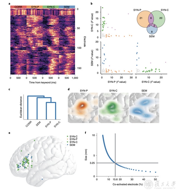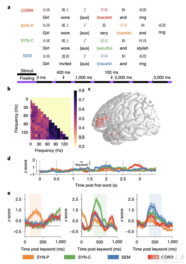 语言是人类最为复杂的认知功能之一,是人类文明传承的载体。区别于其它动物有限的交流系统,人类语言具有高度灵活性,可根据句法规则将有限的符号组合产生无限的语句。半个世纪前,语言学家乔姆斯基提出普遍语法理论,认为句法是独立于语义等其他语言成分的关键部分,这一理论在西方语言研究中得到了大量验证。然而,作为世界上使用人口最多的汉语,其构造主要基于语义特征,句法独立性相对较弱。汉语在人脑中是否存在独立的句法模块来表征和处理句法信息是长期以来汉语语言学、神经科学和心理学等领域研究的一个重要问题,该问题的回答对神经外科手术中语言功能的保护也至关重要。然而,由于语言的加工过程极为精细且具有显著动态特性,给语言神经机制研究带来巨大挑战,虽然此前神经影像研究发现句法和语义都激活额下回和颞中/下回在内的额颞网络,但是否存在句法和语义加工的特异性脑区,一直都没有定论。由于受限于时间和空间分辨率,传统的脑成像和头皮脑电技术并不能在精细时空尺度上考察句法和语义加工的独立性。