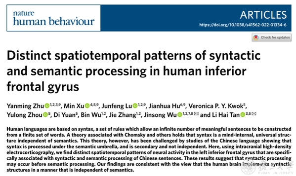 为回答上述问题,近日,深圳市神经科学研究院、暨南大学粤港澳中枢神经再生研究院谭力海教授团队与复旦大学附属华山医院神经外科吴劲松/路俊锋教授团队(复旦大学神经外科研究所脑功能实验室)联合中国社会科学院语言研究所胡建华教授合作采用毫米级别的高密度皮质脑电技术(high-density ECoG),首次发现汉语句法和语义加工在左侧额下回存在显著的时间和空间分离,为理解语言句法加工的神经机制提供了新的见解。北京时间2022年5月26日晚,研究成果以《句法和语义处理在人脑额下回的不同时空表征》(Distinct spatiotemporal patterns of syntactic and semantic processing in human inferior frontal gyrus)为题,在线发表于Nature Human Behaviour。