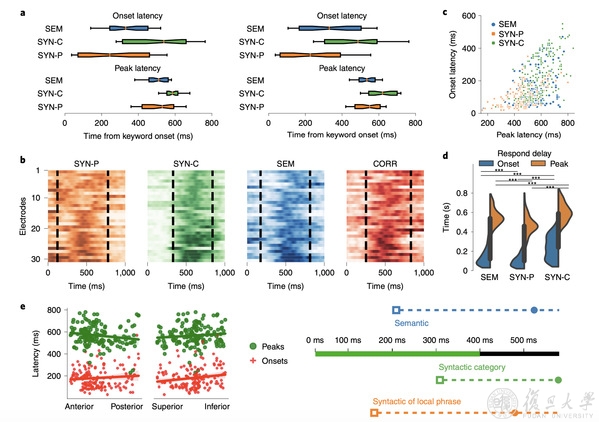 通过分析70Hz-150Hz的神经活动(high gamma波),研究团队发现左侧额下回的不同电极对句法和语义违背具有不同的神经响应(图1e)。进一步分析发现大多数响应电极选择性地对句法或语义之一做出强烈反应(图2a, b),并且这些对句法或语义特异响应的电极在空间上并非聚类在一起,而是离散地分布在额下回(图2c-f)。此外,在神经响应的时间维度上,研究团队发现局部短语结构的句法加工显著早于语义的加工(图3)。