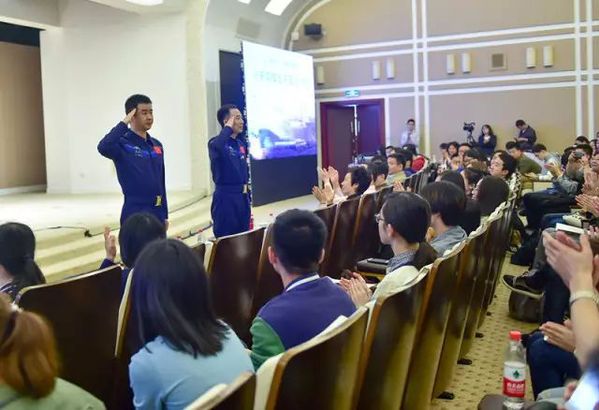 2017年4月17日,神舟十一号载人飞行任务乘组航天员景海鹏、陈冬走进复旦大学,与青年学生分享他们的飞天历程和航天梦想。这是神舟十一号飞船返回地球后,两位英雄航天员同时出席的第一场报告会。