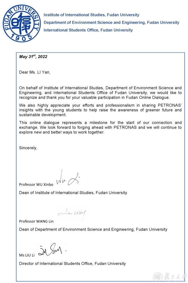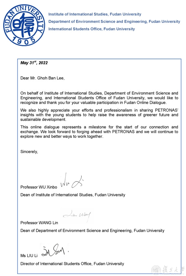 复旦—马石油对话会结束后,复旦大学国际问题研究院院长吴心伯教授、环境科学与工程系系主任王琳教授、外国留学生工作处处长刘莉女士联合向马石油两位主讲人致信感谢,并期待由此次对话会开启两方的合作新旅程。