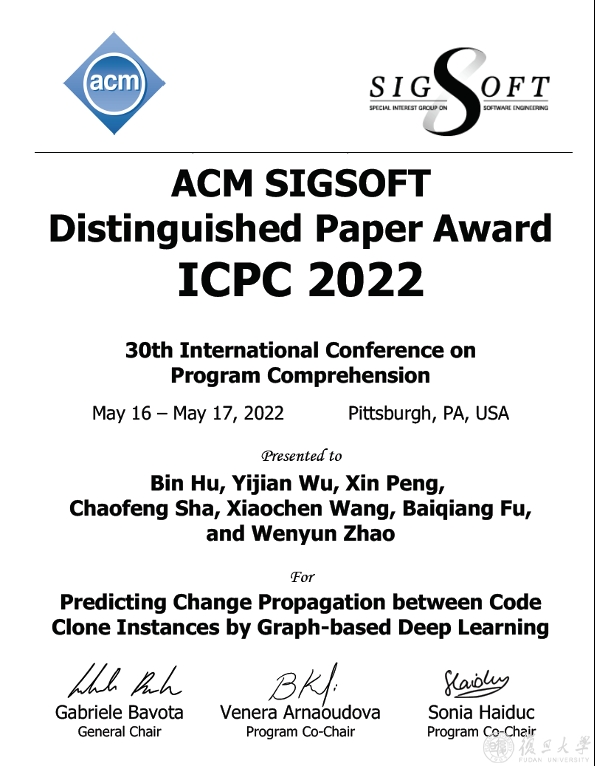 软件学院CodeWisdom团队(复旦大学软件工程实验室)的研究论文《Predicting Change Propagation between Code Clone Instances by Graph-based Deep Learning》近日在在线举办的国际会议International Conference on Program Comprehension (ICPC 2022)中获得优秀论文奖(ACM SIGSOFT Distinguished Paper Award)。ICPC是CCF推荐的B类国际会议,是软件程序理解领域的重要国际会议。