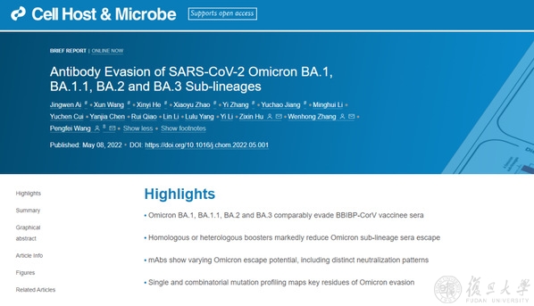 2022年5月8日,Cell Host & Microbe在线发表了复旦大学生命科学院王鹏飞、张文宏以及胡子欣团队题为:Antibody Evasion of SARS-CoV-2 Omicron BA.1, BA.1.1, BA.2 and BA.3 Sub-lineages的研究论文。该研究使用基于VSV的假病毒研究发现接种两剂灭活疫苗(BBIBP-CorV)的个体血清对于Omicron,显示出非常弱或几乎没有中和活性,而同源的灭活疫苗加强针或蛋白亚单位疫苗(ZF2001)的异源加强针则能显著改善针对所有Omicron变体的中和滴度。