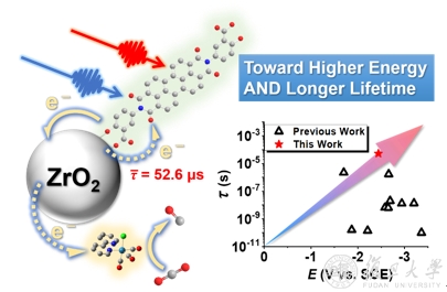近日,复旦大学化学系胡可课题组与北卡罗来纳大学教堂山分校Gerald Meyer教授合作,将PDI光敏剂通过水杨酸基团锚定在介孔纳米晶二氧化锆(ZrO2)(常被看作绝缘体)表面,可见光激发下,2(PDI•–)*的高能电子注入ZrO2导带中,形成的电荷分离态ZrO2(e–)|PDI使高能电子的寿命延长至~53 μs。相比PDI•–的激发态寿命,提升了近6个数量级。该研究成果以“Visible Light Generation of a Microsecond Long-Lived Potent Reducing Agent”为题在线发表于Journal of the American Chemical Society,并被选为正面封面文章(Front Cover Paper)。