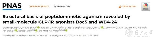 2022年5月14日,复旦大学基础医学院王明伟团队携手中国科学院上海药物研究所杨德华团队在《美国国家科学院院刊》(Proceedings of the National Academy of Sciences of the United States of America)在线发表了题为“Structural basis of peptidomimetic agonism revealed by small-moleculeGLP-1R agonists Boc5 and WB4-24”的研究成果。这篇由2012年诺贝尔化学奖得主Robert J. Lefkowitz教授主审的直投(PNAS Direct Submission)论文报道了全球首个具有体内疗效的胰高血糖素样肽-1受体(Glucagon-like peptide-1 receptor, GLP-1R)非肽类激动剂Boc5及其衍生物WB4-24发挥拟肽效应的结构基础和分子机制,对基于该靶点的药物研发具有重要的指导意义。