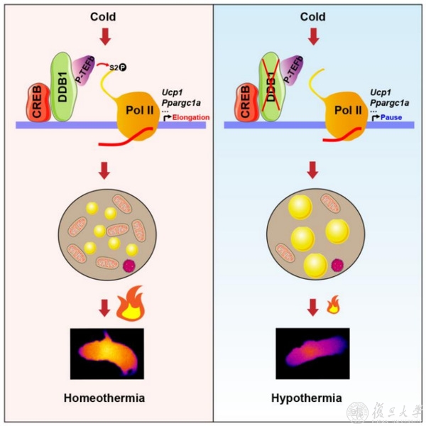 2022年5月13日,复旦大学代谢与整合生物学研究院赵同金课题组在Life metabolism杂志上发表了题为DDB1 Prepares Brown Adipocytes for Cold-Induced Thermogenesis 的研究论文,发现了棕色脂肪细胞中DDB1通过释放暂停的Pol II开启即时响应产热基因转录事件的分子机制,揭示了DDB1在调控棕色脂肪组织应对急性冷刺激下快速产热的生理作用。