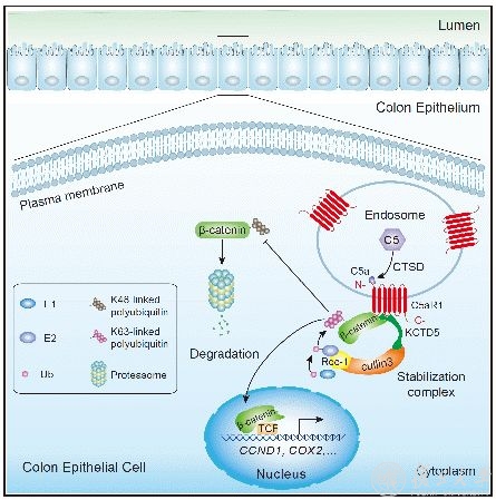 2022年5月31日,生物医学研究院胡维国团队在Cell Reports杂志在线发表了题为“Intracellular complement C5a/C5aR1 stabilizes β-catenin to promote colorectal tumorigenesis”的研究论文。该工作报道了在肠上皮细胞内也存在补体C5的激活,所产生的活性产物C5a与其受体C5aR1结合,在细胞内调控关键分子β-catenin的蛋白稳定性,从而促进CRC的发生发展。上述研究结果为结直肠癌的预防和治疗提供了新的思路。