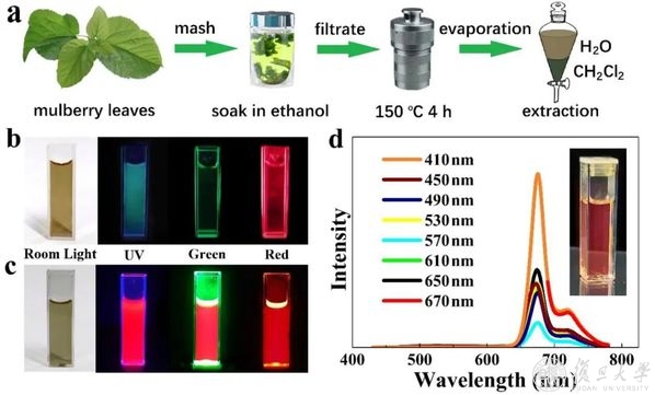 熊焕明教授课题组以桑叶为原料制备深红色发光的碳点(R-CDs),所制备的R-CDs的主发射峰位于676 nm,肩峰位于725 nm,半峰宽仅有20 nm, 量子产率高达73%,是目前已知的最亮的深红色发光碳点。激发光波长从紫外变化到红光区,R-CDs都能发射强烈的红色荧光,甚至在阳光下的荧光都是肉眼可见的!用R-CDs喂养的蚕也在绿光照射下就能进行高清晰的荧光成像,避免了通常紫外灯光照的伤害。上述研究成果以“Mulberry-Leaves-Derived Red-Emissive Carbon Dots for Feeding Silkworms to Produce Brightly Fluorescent Silk”为题发表于国际一流学术刊物《先进材料》上(Adv.Mater.2022,34,2200152)。