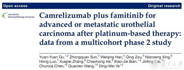 复旦大学附属肿瘤医院叶定伟教授领衔团队开展卡瑞利珠单抗联合苹果酸法米替尼治疗尿路上皮癌(UC)多中心、开放、单臂Ⅱ期研究,相关研究成果近日在线发表于肿瘤免疫治疗学会官方期刊Journal for ImmunoTherapy of Cancer。该研究率先探索国产卡瑞利珠单抗联合法米替尼在晚期尿路上皮癌的治疗疗效并取得突破,填补了免疫联合抗新生血管靶向这一组合方案在中国晚期尿路上皮癌治疗领域的空白,开启了国人晚期尿路上皮癌治疗新篇章。