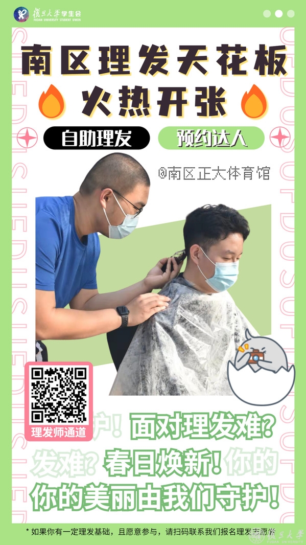 疫情期间,这个“南区理发天花板”的负责人便是校学生会主席李俨达。方案策划、场地借用、物资筹备、宣传推广,他对每个板块的工作都要关心推进。
