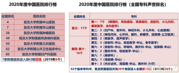 复旦上医现有中山、华山、肿瘤、妇产科、儿科、眼耳鼻喉科医院等直属附属医院,医疗实力雄厚。最新公布的中国公立三甲医院绩效考核中,全国仅有复旦上医与北医拥有两家附属医院进入全国十强,其中中山医院上海排名第一。