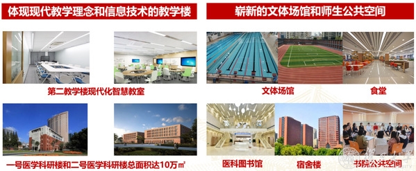 复旦上医位于市中心,与中山医院一墙之隔,校门口地铁七、九号线交汇,交通便利。医科图书馆全国领先,总面积18225平方米,座位约1700余席,2022年医科馆“图书馆达人冲冲冲”项目荣获国际图书馆协会联合会评比的十大创意奖项。本科生均入住新建的书院大楼,四人一间,有独立卫生间,24小时热水供应,配备空调网络、公共会客室、洗衣房等。校区四个餐厅宽敞明亮、风味齐全,曾经被央视新闻频道报道为高校最美餐厅。校区还配备温水游泳馆、运动场、健身房、乒乓房、室内篮球馆等运动设施。