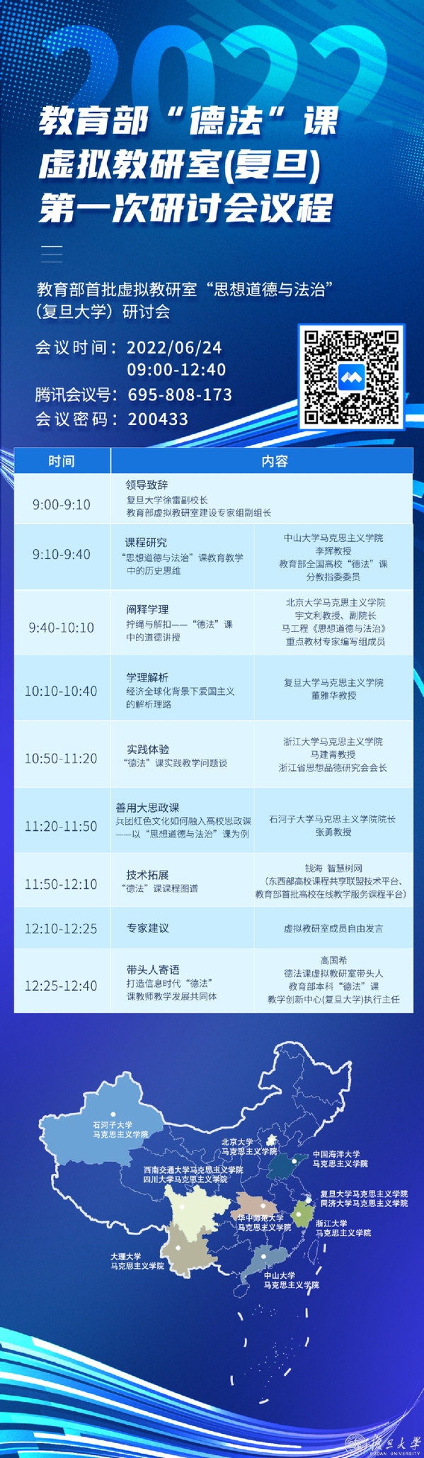 2022年6月24日,教育部首批虚拟教研室建设试点复旦大学“思想道德与法治”虚拟教研室第一次研讨会通过线上会议的方式顺利召开。来自虚拟教研室成员单位北京大学、浙江大学、中山大学、四川大学、西南交通大学、华中师范大学、中国海洋大学、石河子大学、大理大学等高校马克思主义学院的50余位专家学者出席了会议。本次研讨会以“德法”课教学的课程研究、学理阐释和实践解析为脉络,基于现代信息技术,对虚拟教研室该如何在全媒体时代进行改革、创新与建设开展交流与讨论。
