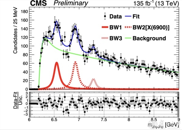 CMS实验在双J/ψ质量谱上看到3个共振峰,从左到右依次为:X(6600)、X(6900)、X(7300)