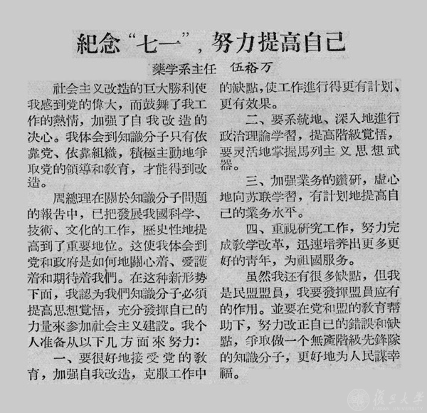 直至晚年,伍裕万仍然十分关心我国药学事业的发展,这种生命不息、奋斗不止的精神,将鼓舞一代又一代的复旦上医人为祖国的药学事业作出更大贡献。