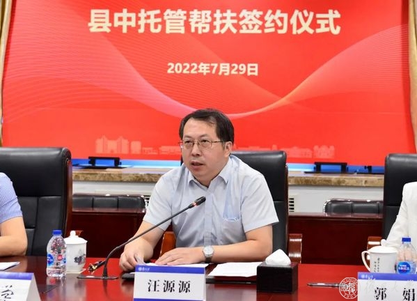 汪源源为会议致辞,他表示做好县中托管帮扶工作,是复旦大学服务国家乡村振兴和人才发展战略义不容辞的社会责任,学校党委高度重视,成立工作专班专项推进相关工作。他提出三点工作希望。一是要提升政治站位,全面落实工作要求,协同一致办好县中,办好人民满意的教育。二是要积极统筹资源,充分发挥复旦大学高校优势,分享附中优质资源和经验,将复旦大学在助力乡村振兴中的教育帮扶实践经验,应用到县中托管帮扶工作中。三是要精心组织实施,深入调研,对接县中实际需求,进一步细化工作方案,推动各项帮扶措施落实到位,将好事做好,实事办实。