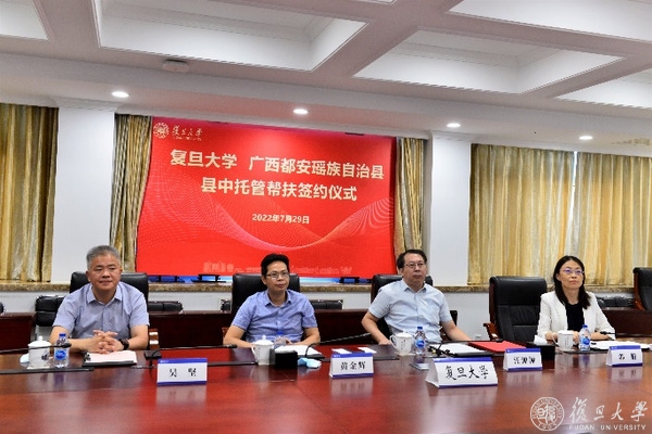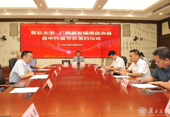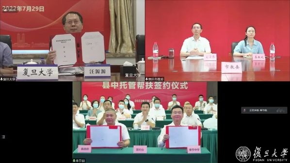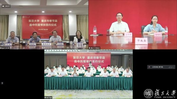 7月29日上午,复旦大学先后举行与广西都安瑶族自治县、重庆市奉节县县中托管帮扶签约仪式。视频在线签署《教育部直属高校县中托管帮扶项目协议书》,托管帮扶广西都安瑶族自治县高级中学、重庆市奉节中学两所县域高中。