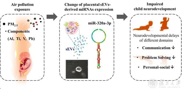 复旦大学公共卫生学院张蕴晖教授团队近日在Science of the Total Environment杂志在线发表了题为“Prenatal fine particulate matter exposure associated with placental small extracellular vesicle derived microRNA and child neurodevelopmental delays”的论文,着重探讨了产前PM2.5及组分暴露对儿童神经发育的影响,并探究了胎盘小细胞外囊泡(small extracellular vesicles,sEVs)来源的miRNA在其中的潜在作用。基于PM2.5个体监测,本研究较为全面地评估了产前PM2.5及化学组分对婴幼儿神经发育的影响,为识别和鉴定PM2.5神经发育毒性效应的关键组分提供了数据支持。此外,本研究首次从胎盘sEVs来源miRNA角度,探究了产前PM2.5及其组分暴露影响子代神经发育的生物机制,为PM2.5的神经发育毒性机制研究提供了新的方向和思路。