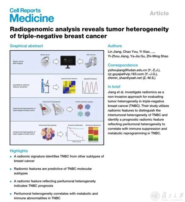 “仅通过乳腺癌患者增强磁共振影像资料,无需穿刺,便可精准预测三阴性乳腺癌的分型分类;基于数字病理图像构建的神经网络模型,通过一张小小的病理HE染色切片,数小时便可明确三阴性乳腺癌分子分型和关键治疗靶点……”近日,复旦大学附属肿瘤医院精准肿瘤中心主任、乳腺外科主任邵志敏教授团队,联合医院放射诊断科主任顾雅佳教授团队、病理科副主任杨文涛教授团队,并与复旦大学类脑智能科学与技术研究院王鹤研究员团队、南京信息工程大学徐军教授团队“医工携手”,通过“院内多学科团队联合+跨区域医工交叉协作”的方式,为三阴性乳腺癌的临床诊断研制出了“复旦肿瘤”智能方案。相关研究成果在美国《细胞》杂志旗下期刊《细胞报告·医学》、国家自然科学基金委旗下期刊《基础研究》在线发表。