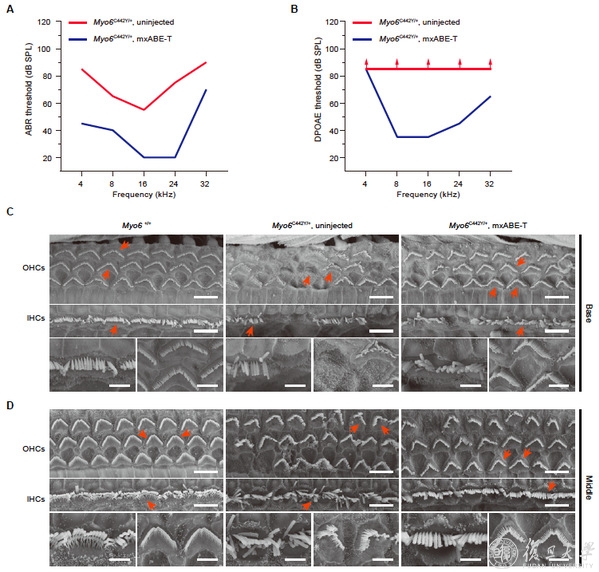7月21日,国际顶尖期刊《科学转化医学》(Science Translational Medicine)在线发表了复旦大学附属眼耳鼻喉科医院舒易来主任、李华伟教授和中科院脑智卓越中心杨辉研究员合作的研究论文“Rescue of autosomal dominant hearing loss by in vivo delivery of mini dCas13X-derived RNA base editor”(基于迷你型dCas13X开发的RNA碱基编辑器治疗常显性遗传性耳聋)。该研究基于新型的RNA编辑工具dCas13X,研发了精准治疗显性遗传性耳聋的前沿技术——针对常见显性遗传性耳聋基因肌球蛋白(MYO6)的RNA单碱基编辑器(mxABE),成功改善了动物模型的听力。这是国际上首个基于RNA单碱基编辑技术成功精准治疗显性遗传性耳聋的研究,为耳聋的精准治疗以及安全的临床转化提供了有力的科学证据。