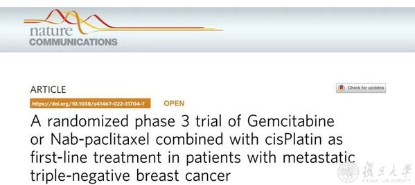 复旦大学附属肿瘤医院王碧芸、胡夕春教授团队领衔的GAP研究是一项全国多中心的随机对照3期临床试验,对比了白蛋白紫杉醇+顺铂与吉西他滨+顺铂一线治疗转移性三阴性乳腺癌患者的疗效及安全性。近日,相关研究成果以《A randomized phase 3 trial of Gemcitabine or Nab-paclitaxel combined with cisPlatin as first-line treatment in patients with metastatic triple-negative breast cancer》为题,在线发表于国际学术期刊《自然通讯》(Nature Communications)上。