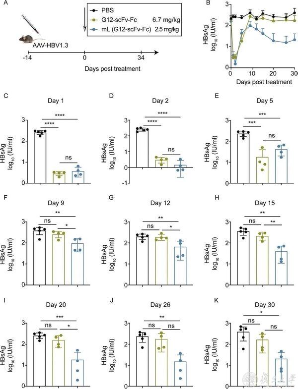 近日,上海市重大传染病和生物安全研究院双聘PI、复旦大学基础医学院的应天雷,吴艳玲团队和上海市重大传染病和生物安全研究院双聘PI、复旦大学生命科学学院林金钟团队合作,发现mRNA-LNPs首次被用于表达抗-HBsAg抗体(G12-scFv,G12-scFv-fc,G12-IgG)。在具有持续HBsAg表达的腺相关病毒(AAV)/HBV小鼠模型里,G12-scFv-Fc-和G12-IgG-编码的mRNA-LNPs对血清HBsAg清除有持续的影响。这些发现可能为功能性治疗乙肝病毒提供一种新的联合治疗方案。例如,这种策略可以为体内的抗体提供一种“三明治”疗法,进一步增强治疗的免疫性能。总的来说,mRNA疗法在感染性疾病的治疗中很有前景,因为它们发展迅速,经济价值高,而且简单易行。该研究成果在杂志 mBio 上发表,题为“A Single Dose of Anti-HBsAg Antibody-Encoding mRNA-LNPs Suppressed HBsAg Expression: a Potential Cure of Chronic Hepatitis B Virus Infection”。