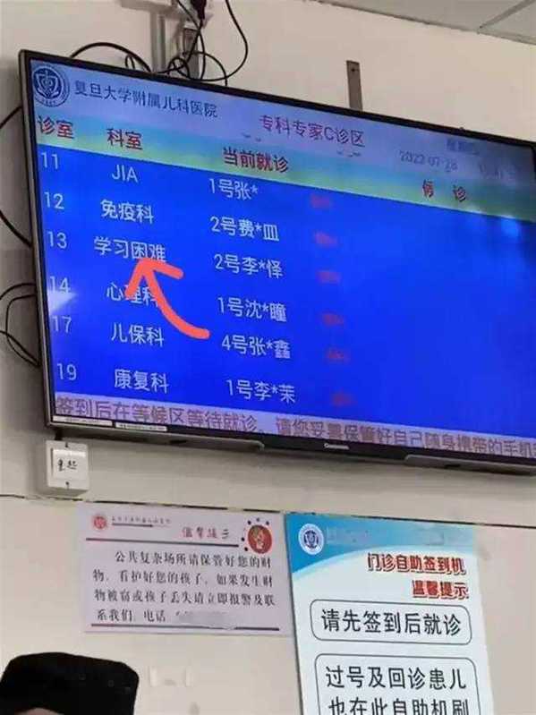 最近两天,复旦大学附属儿科医院的“学习困难”门诊上了热搜。起因是,7月28日,上海一市民带孩子到复旦大学附属儿科医院体检,看到叫号的显示屏上有个“学习困难科”,广播喊2号某某某就诊。这个家长震惊了,拍照发视频调侃说:“我读书的时候要是有这个科,爸妈高低给办个VIP”。