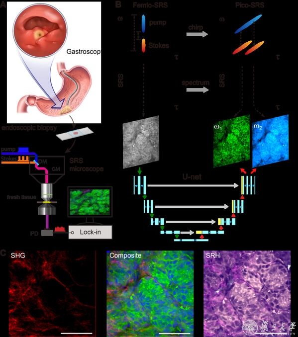 近日,我校物理学系季敏标教授课题组与我校附属中山医院周平红教授课题组合作,开发了飞秒受激拉曼病理成像技术,实现对胃内镜活检组织的准实时智能诊断。相关研究成果以《深度学习的单帧飞秒受激拉曼病理显微镜实现胃内镜活检的即时诊断》(“Instant diagnosis of gastroscopic biopsy via deep-learned single-shot femtosecond stimulated Raman histology”)为题在线发表于《自然·通讯》[Nature Communications, 13, 4050 (2022)]。
