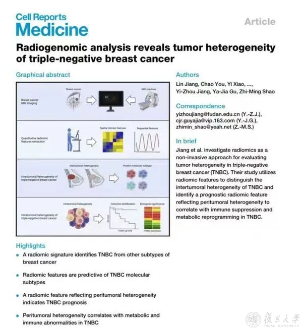 近日,我校附属肿瘤医院精准肿瘤中心主任、乳腺外科主任邵志敏教授团队,联合医院放射诊断科主任顾雅佳教授团队、病理科副主任杨文涛教授团队,并与我校类脑智能科学与技术研究院王鹤研究员团队、南京信息工程大学徐军教授团队“医工携手”,通过“院内多学科团队联合+跨区域医工交叉协作”的方式,为三阴性乳腺癌的临床诊断研制出了“复旦肿瘤”智能方案。相关研究成果在美国《细胞》杂志旗下期刊《细胞报告·医学》、国家自然科学基金委旗下期刊《基础研究》在线发表。