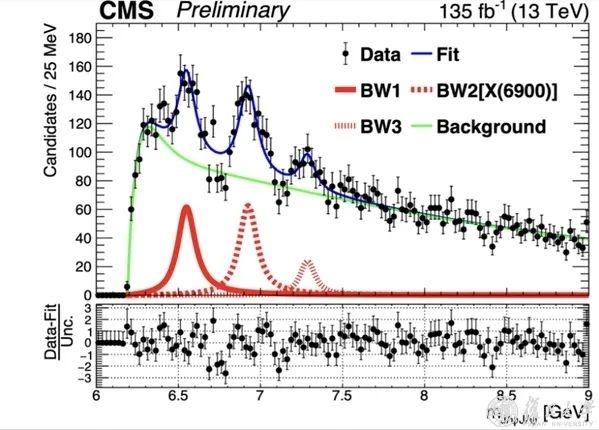 7月9日,在第41届国际高能物理大会(ICHEP2022)上,欧洲大型强子对撞机LHC上的CMS实验国际合作组报告了最新的奇特粒子实验进展:发现了一个可能由全粲四夸克组成的奇特粒子家族。这是中国科学家首次在CMS实验上主导新粒子的发现。现代物理研究所代表复旦大学于2019年12月正式加入其中。近年来,中国CMS组在希格斯粒子性质测量和多玻色子研究等方面成绩突出,本次全粲四夸克态家族的发现进一步提升了中国科学家在高能物理国际合作组中的地位。我校现代物理研究所博士后高旭阳承担了大部分蒙特卡洛产生工作,为最终质量谱的本底成分研究和拟合策略制定提供了重要输入信息。