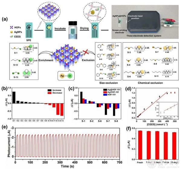 近日,我校化学系李鹏课题组合成了一类银纳米颗粒负载的氢键有机骨架(AgNPs@HOFs)光电活性材料,与传统半导体以及MOF材料相比,这种AgNPs@HOFs材料展现出优异的光电转换能力。利用该材料构建便携芥子气模拟物2-氯乙基乙基硫醚(CEES)光电化学传感器,实验发现这种器件在实际操作场景的应用潜力,而且为进一步发展具有超高灵敏度和选择性的新型硫醚类化合物传感器提供可能。相关研究工作日前以《Ultrafine Silver Nanoparticle Encapsulated Porous Molecular Traps for Discriminative Photoelectrochemical Detection of Mustard Gas Simulants by Synergistic Size-exclusion and Site-specific Recognition》为题发表于Advanced Materials上。