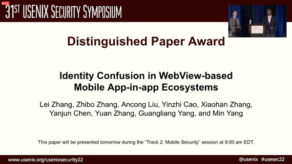 日前,复旦大学计算机科学技术学院杨珉教授领衔的系统与软件安全实验室发表的论文“Identity Confusion in WebView-based Mobile App-in-app Ecosystems”,荣获网络安全国际顶尖学术会议31st USENIX Security Symposium杰出论文奖(Distinguished Paper Award)。该论文聚焦移动应用小程序的生态安全问题,揭示微信、支付宝、抖音、今日头条等一批主流软件面临的安全威胁,帮助避免数十亿用户的信息安全风险。
