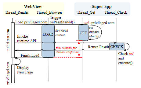 通过分析WebView的代码、逻辑、基础架构的软件行为,团队发现一批普遍影响各类小程序框架中的访问控制漏洞问题(Identity Confusion),利用这些漏洞,黑客可以悄无声息地溜进受害者使用的宿主应用中,越权调用特权接口,泄露用户敏感数据、控制用户账户等。