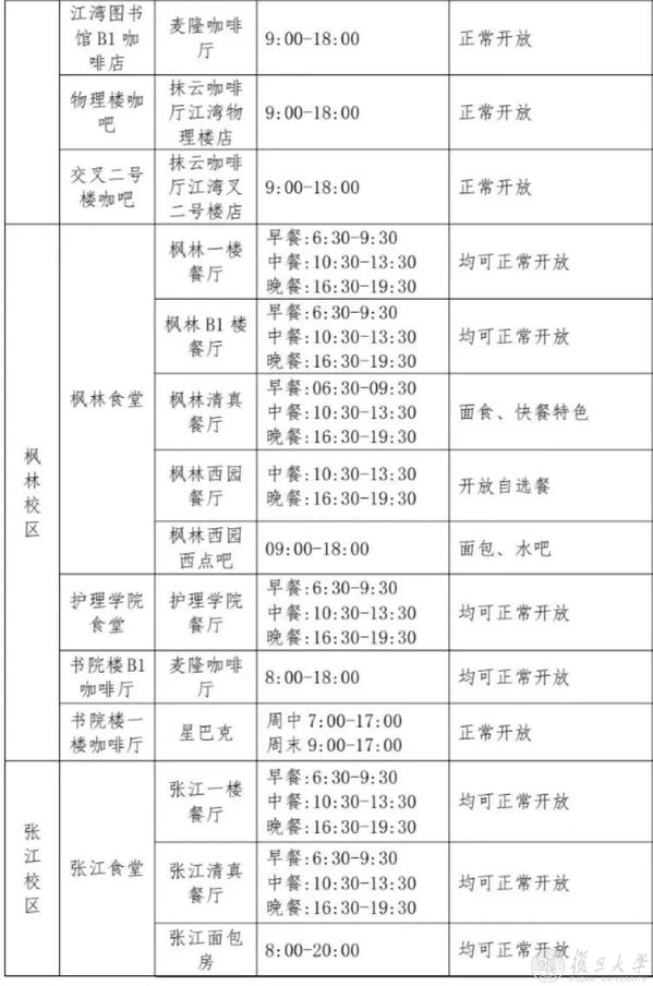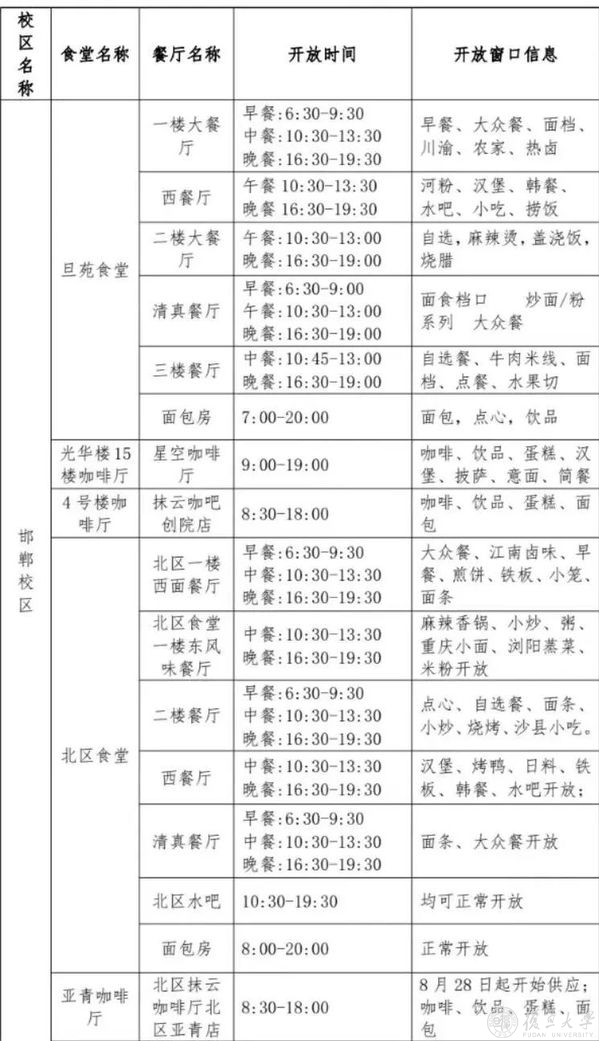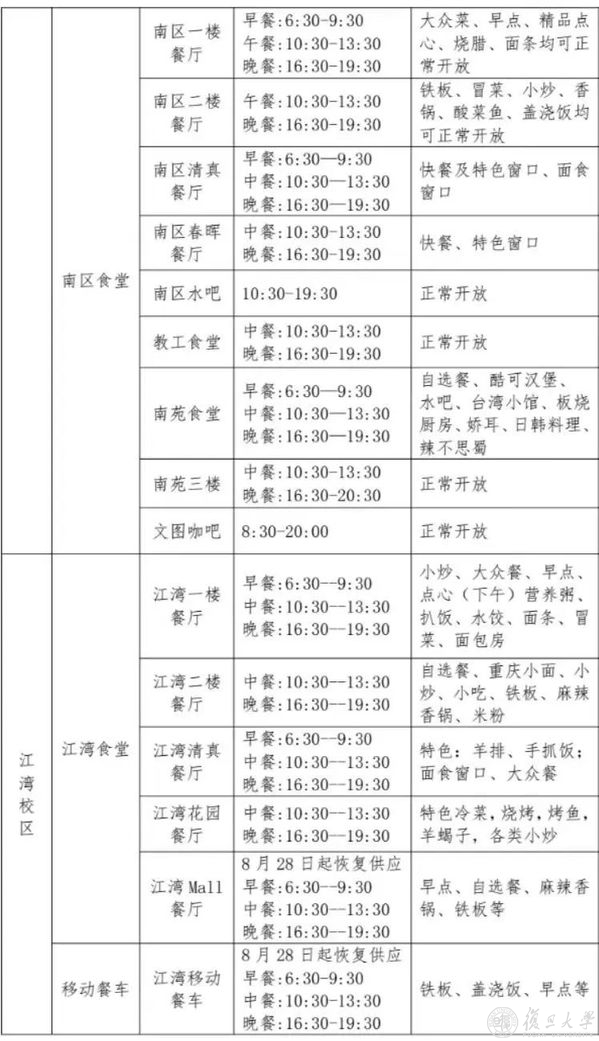 8月20日开始,四校区所有食堂、咖啡厅、面包房、招待餐厅全面开放供应(邯郸校区北区抹云咖吧亚青店、江湾校区移动餐车、江湾光华Mall餐厅推迟一周,从8月28日起开始恢复供应)。