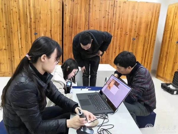 郝雪琳(左二)正在进行原始瓷科技检测