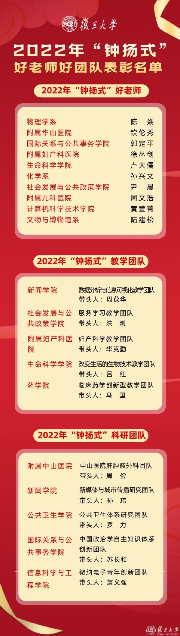 会上,校党委常务副书记周亚明宣读《关于表彰复旦大学2022年“钟扬式”好老师、好团队的决定》,焦扬、金力共同向获奖个人和团队颁发荣誉证书。