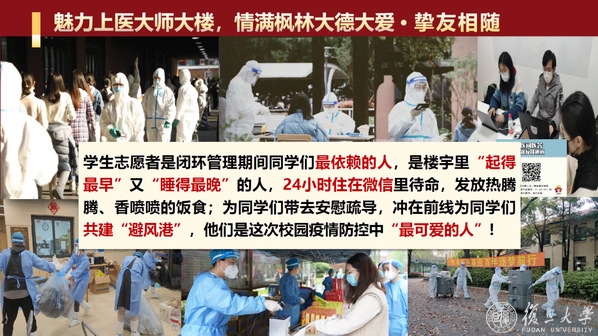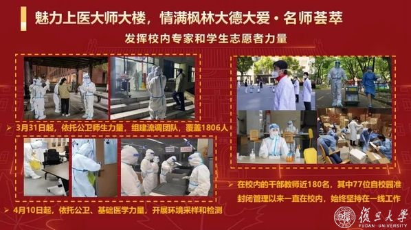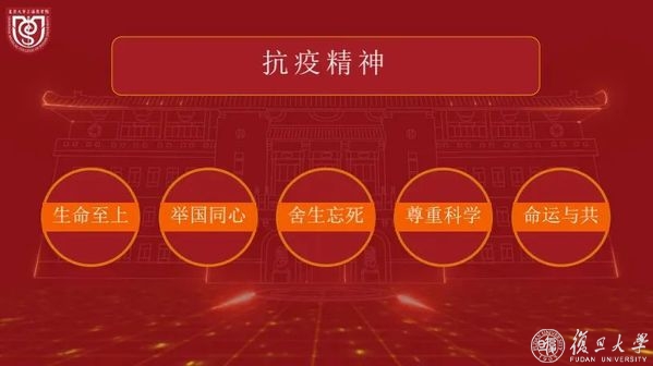 “‘生命至上、举国同心、舍生忘死、尊重科学、命运与共’,在与病毒抗争的一线,上医人在身体力行,彰显了伟大的抗疫精神。“袁正宏讲述了颜福庆、苏德隆、钱惪等上医前辈在抗击传染病中做出的重要贡献,以及在当前抗击新冠肺炎疫情过程中,钟鸣、张文宏等奋战抗疫一线的上医人的故事,“沙场点兵,英雄出征,越是面对风险与挑战,复旦上医人越是冲在最前面。”