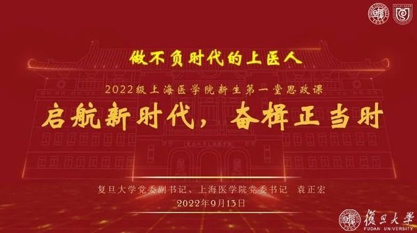 “复旦大学上海医学院将要成为你们新征程的起点,‘复旦上医人’这个名字将要相伴大家一生。再过一个月,我们即将迎来上医95周岁生日。希望大家通过这一堂课,为自己的选择高兴,更有自豪感和归属感,对未来更充满信心。”袁正宏首先欢迎2022级新生在上医创建95周年之际加入上医的大家庭,并把新生第一堂思政课的主题定为“启航新征程,奋楫正当时,做不负时代的上医人”,通过回顾上医辉煌历史,展示复旦上医的最新发展,为初入医学大门的上医学子送上谆谆教诲和殷切寄语。