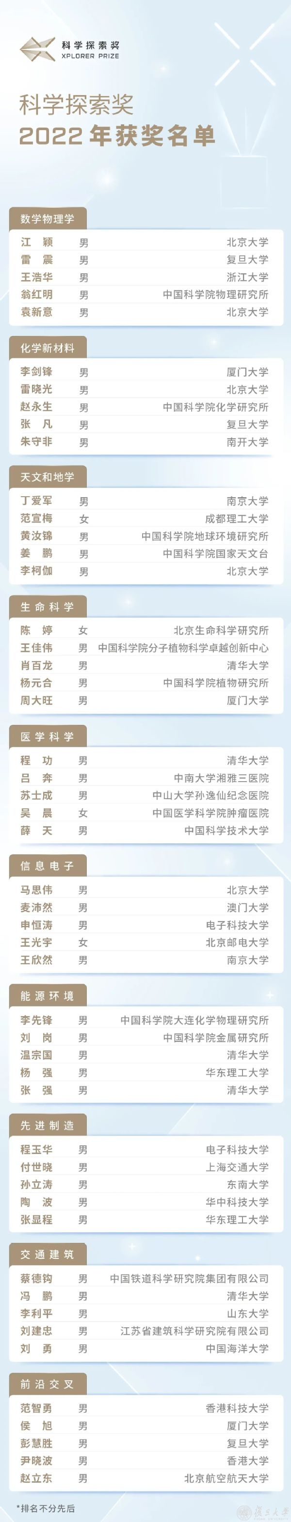 “科学探索奖”是一项由科学家主导的公益性奖项,是目前国内金额最高的青年科技人才资助计划之一。今年,“科学探索奖”评审委员在数学物理学、化学新材料、天文和地学、生命科学、医学科学、信息电子、能源环境、先进制造、交通建筑、前沿交叉共10个领域遴选出50名、年龄不超过45岁的中青年科学家进行资助。