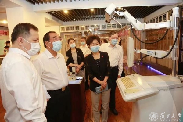 随后,丛斌一行来到枫林校区东苑,先后参观了福庆广场、人体科学科普教育基地,复旦大学上海医学院基础医学院教授、九三学社复旦大学委员会原副主委、上医分委员会原主委周国民作讲解。