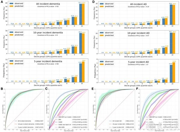 UKB-DRP痴呆预测模型对未来五年、十年甚至更长时间的全因痴呆和阿尔茨海默病的预测效能均较高,其中全因痴呆的预测AUC值为0.85,而阿尔茨海默病的预测AUC值更高,可达0.86-0.89。研究团队进一步对UKB-DRP预测痴呆模型的风险校准度进行了评估,结果显示风险校正后的观测风险和预测风险匹配良好,即模型预测的新发痴呆事件和观察到的痴呆发生事件一致性较高。此外,研究团队也将UKB-DRP痴呆预测模型与国际上已发表的预测模型(如CAIDE、DRS、ANU-ADRI)进行了比较,结果表明UKB-DRP痴呆预测模型的预测精度显著优于其他的预测模型(图2)。
