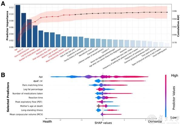 这十个预测因子包括:年龄、载脂蛋白E(ApoE)基因、认知配对测试时长、腿部脂肪百分比、服药数量、认知反应测试时长、呼气峰流量、母亲死亡年龄、慢性疾病和平均红细胞体积(图1)。