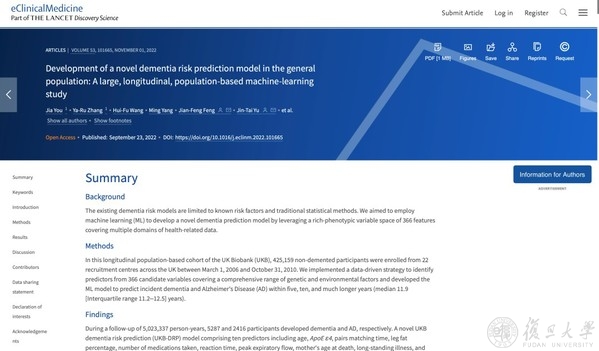 9月23日,相关成果以“基于普通人群开发的痴呆风险预测模型:基于机器学习的大型纵向队列研究”(“Development of a novel dementia risk prediction model in the general population: a large longitudinal population-based machine-learning study”)为题发表于《柳叶刀》子刊(eClinicalMedicine)。