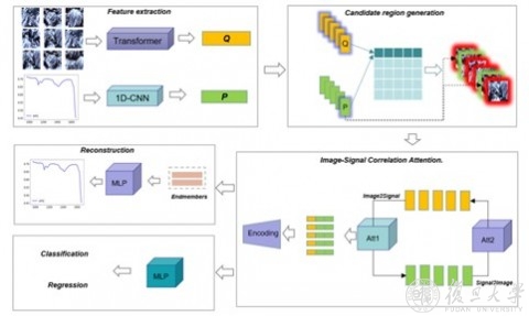 其中候选区域生成模块通过相似度计算与 NIR 特征进行成对匹配,捕获能够有效反映纺织品物理成分的候选图像区域;在图像信号双向相关注意力模块中,候选图像和近红外特征首先通过评分模块进行匹配,然后通过双向权重来计算信号到图像,图像到信号的全局相关性。接下来,该网络对提取的特征进行解混计算,首先通过可学习的聚类参数生成端元向量,然后经过非线性层进行近红外信号重建。