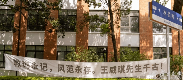 复旦校园内,师生们敬上的卡片与白菊放满了恒隆物理楼的灵堂,缅怀他的横幅悬挂于邯郸校区恒隆物理楼与江湾校区二号交叉学科楼前。