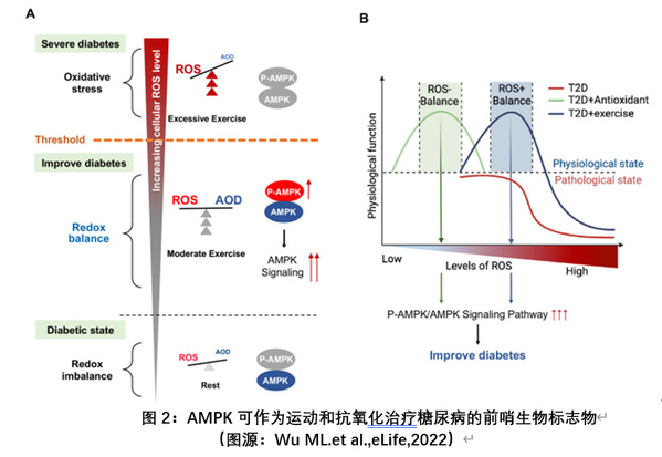 适量的运动可以减轻许多疾病的症状,包括精神、神经、代谢、心血管、肺部、肌肉骨骼,甚至癌症(1)。然而,关于如何界定适量运动和过量运动尚没有一个合适的生物标记物。作者在之前的工作发现调节肝脏的氧化还原平衡可以改善血糖控制(2)。本研究中作者发现在运动过程中,运动产生的不同水平的ROS对肝脏AMPK的活性和表达具有不同的调节作用。适度的运动产生的ROS促进了肝脏AMPK谷胱甘肽化的激活。然而,过度运动使线粒体功能受损,增加了氧化损伤,抑制了AMPK的活性和表达。作者首次提出AMPK的激活/降解结合氧化损伤的指标,可以研究作为糖尿病运动干预时的氧还状态变化的“前哨”标志物(sentinel biomarker),用以分析判别适度和过度运动的氧化还原平衡状态阈值,以指导适当的运动或抗氧化剂干预。