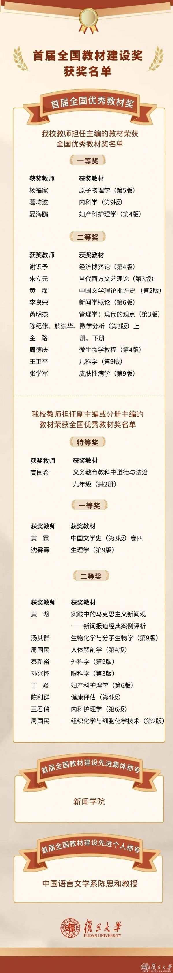 教材建设先进集体”“全国教材建设先进个人”名单、首届学校教材建设奖获奖者名单以及首批“七大系列精品教材”建设项目入选名单。裘新指出,学校教材工作取得的成绩是全体师生共同努力的成果,希望复旦教师牢记为党育人、为国育才初心使命,坚持正确政治方向,继承优良传统,推进改革创新,用心打造更多高水平教材,为学校编写出培根铸魂、启智增慧、体现复旦水平的高质量教材。