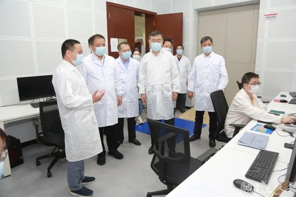 随后金力一行慰问了郑长林教授课题组师生。在双球差校正透射电子显微实验室里,郑长林介绍了实验室运行情况与发展规划。金力表示,学校将进一步支持大型设备的引进与应用,助力高端技术发展。