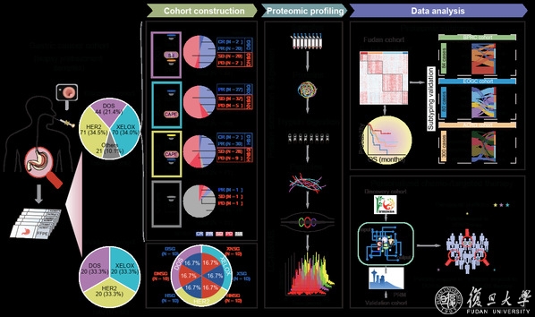 基于此,复旦大学人类表型组研究院/生命科学学院丁琛教授团队、复旦大学附属中山医院侯英勇教授团队和上海交通大学医学院附属新华医院赵健元教授团队联合对接受一线治疗 (包括DOS治疗,XELOX治疗及抗HER2靶向联合治疗) 的206例中国胃癌患者的治疗前样本进行了蛋白质组学定量分析 (图1),相关研究成果以“蛋白质组学特征揭示了胃癌对化疗和靶向治疗反应的治疗新策略(Proteomic Characterization of Gastric Cancer Response to Chemo and Targeted therapies Reveals New Therapeutic Strategies)”为题,于北京时间2022年9月29日在线发表于最新一期《自然·通讯》(Nature Communications)杂志上。