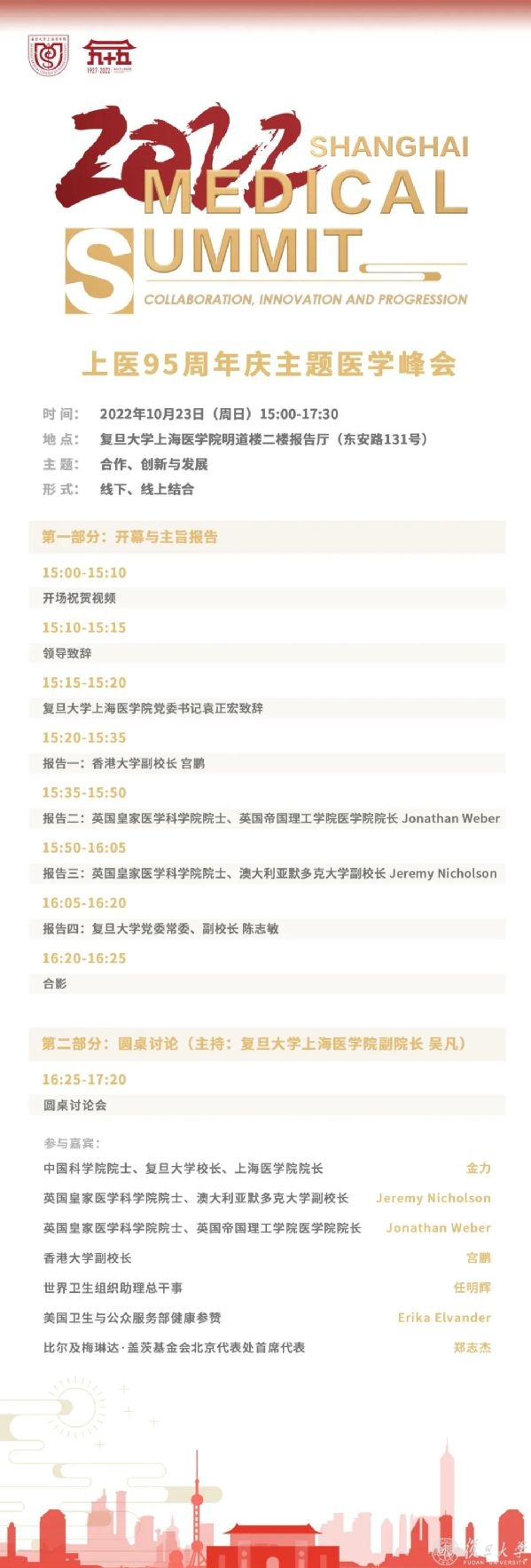 值此院庆之际,以“合作、创新与发展”为主题的“上医95周年庆主题医学峰会”将于2022年10月23日下午3时举办。此次论坛是医学界杰出专家学者们集思广益和交流新观点与新思想的共同平台,旨在凝聚全球共识、汇集各方智慧,吸收借鉴国际先进经验,为医学教育理念创新、公共卫生治理模式探索、国际学术交流做出贡献。